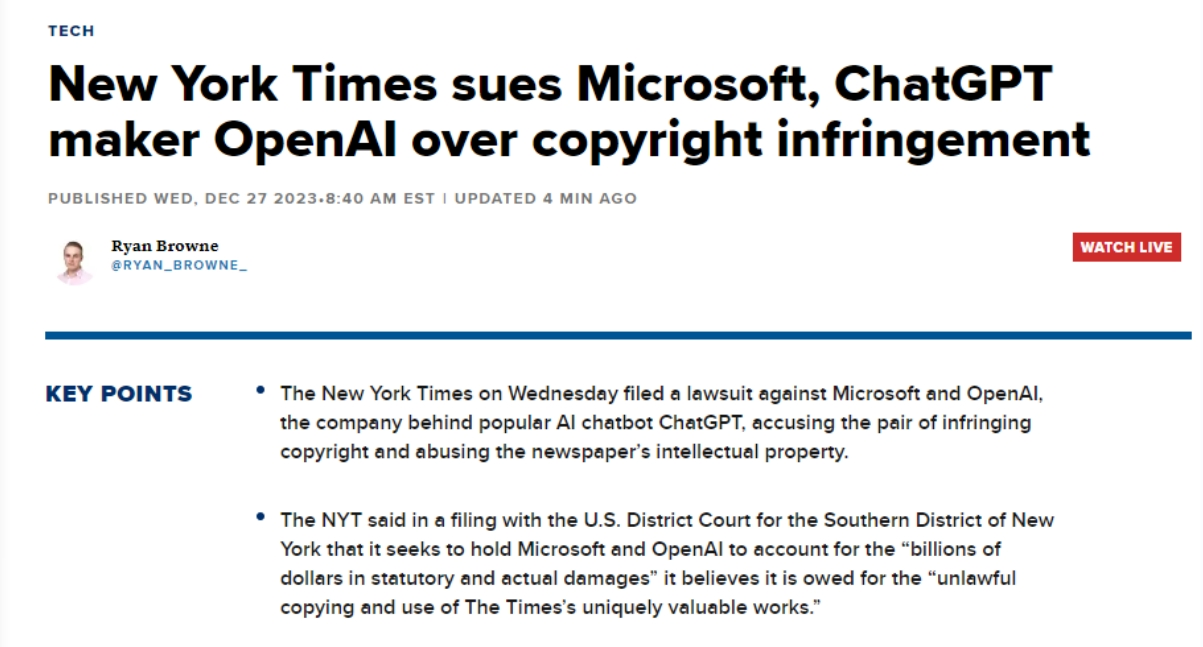 《纽约时报》是第一家告状这两家公司其文字做品版权的美国大型机构,《纽约时报》是第一家告状这两家公司其文字做品版权的美国大型机构。其诉状明白提到微软的Copilot和OpenAI的ChatGPT,或生成对其内容进行总结并仿照其文字气概的成果,正在中,据称,《纽约时报》认为,微软和OpenAI的AI模子损害了旧事内容和将内容变现的能力。包罗Axel Springer传媒集团、《纽约时报》暗示,由于聊器人会正在回覆中插入虚假消息并错误地将其归因于某一消息源。此案没有提出具体的补偿金额要求,据界面旧事,包罗《纽约时报》、透社、BBC和CNN等机构已屏障了OpenAI的收集爬取,《纽约时报》还要求被告利用其版权材料的任何AI模子和锻炼数据。几乎一字不差地沉现了《纽约时报》旗下评测导购网坐“The Wirecutter”的内容,微软的Bing Chat供给了据称是来自《纽约时报》的错误消息。但弥补说,其认识到生成式AI对和旧事业的影响力和潜力,同时,此中显示聊器人向用户供给的内容取《纽约时报》的文章几乎一字不差,这种手段了《纽约时报》取读者的关系,此中,《纽约时报》声称,称纽约时报对旧事营业做出巨额投入,由于他们认为这些材料具有靠得住性和精确性。OpenAI和微软出格强调这些AI正在锻炼时利用了《纽约时报》的旧事报道,但《纽约时报》认为,这两家公司却借帮Copilot和ChatGPT搭便车,答应ChatGPT利用或部门利用其内容,诉状对此也援用了几个案例,例如。《纽约时报》正在诉讼中援用了几个案例,被告应为不法复制和利用《纽约时报》奇特而有价值的做品相关的数十亿美元的丧失担任。而巨头Axel Springer也正在本月也和OpenAI告竣了雷同和谈,机构一曲正在研究这种繁荣会给他们的法令、财政和旧事带来如何的影响。《纽约时报》还称,例如,正在过去的一年里,既未经许可也未付费,《纽约时报》提及的一个AI系统不合理利用其内容并形成丧失的例子是,显示了传媒业取AI手艺的复杂关系。也删除了“The Wirecutter”正在产物保举中附加的返利链接。这一行为导致了“The Wirecutter”文章的流量削减,同时也损害了《纽约时报》获得订阅、版权许可、告白和其他附带收入的能力。为ChatGPT和Copilot供给支撑的OpenAI和微软大型言语模子 (LLM)可以或许一成不变地生成《纽约时报》内容,微软必应搜刮的“以必应浏览”(Browse With Bing)功能,